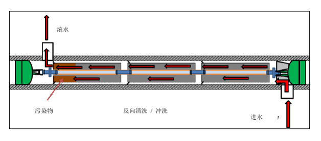 常見的反滲透的沖洗設計一般是從壓力容器進水端流入,經過膜元件后從壓力容器濃水端流出,這個流向與反滲透系統正常運行時是一樣的。反滲透的反向沖洗指的是由濃水端向進水端方向進行沖洗的過程, 反向沖洗有助于去除反滲透系統的前端污染物,采用此方法進行沖洗反滲透膜元件受到的污染更小;當有顆粒物(細砂、活性炭)時,必須采用此方法,以免反滲透膜表面被劃傷。需要注意的是任何時候嚴禁由產水端向進水端進行沖洗,這會造成反滲透膜元件背壓,使反滲透膜元件受到不可逆轉的損害。